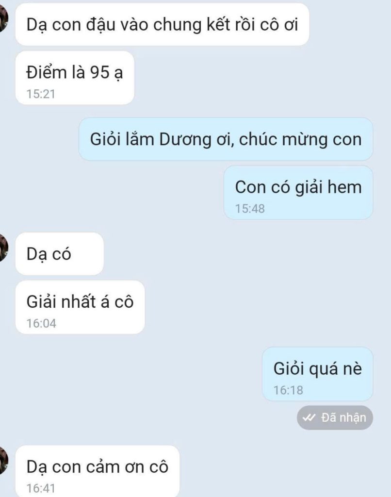 Tuy nhiên, điều khiến cô lựa chọn kiên trì không nằm ở thành tích cá nhân, mà ở sự thay đổi của học trò. Từ những học sinh có học lực trung bình dần vươn lên khá, giỏi; từ những em gần như mất gốc tiếng Anh từng bước đạt kết quả tốt hơn trong các kỳ thi Cambridge như Starters, Movers, Flyers. Nhiều học viên khác tiếp tục đạt điểm cao trong các kỳ thi KET, PET, thậm chí trở thành nhóm học sinh top đầu với điểm đầu vào ấn tượng tại những ngôi trường mơ ước.